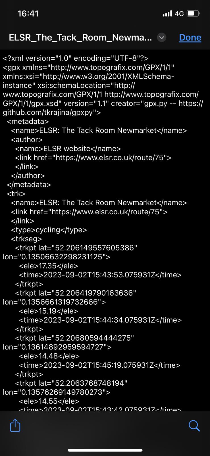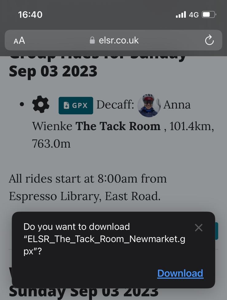 Locate the GPX file on the ELSR website, which you wish to download. In this example we are using Anna's decaff Sunday ride to The Tack Room in Newmarket.