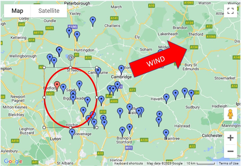 In our example, we're looking for a cafe SW / W of Cambridge. Look at the list of cafes on this site to see what options you have e.g. in our example below, all the cafes circled would have a tail wind on the return leg to Cambridge.